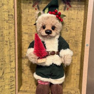 Her little Teddy is created from hand dyed German alpaca with black Austrian crystal eyes, hand embroidered and a waxed nose.